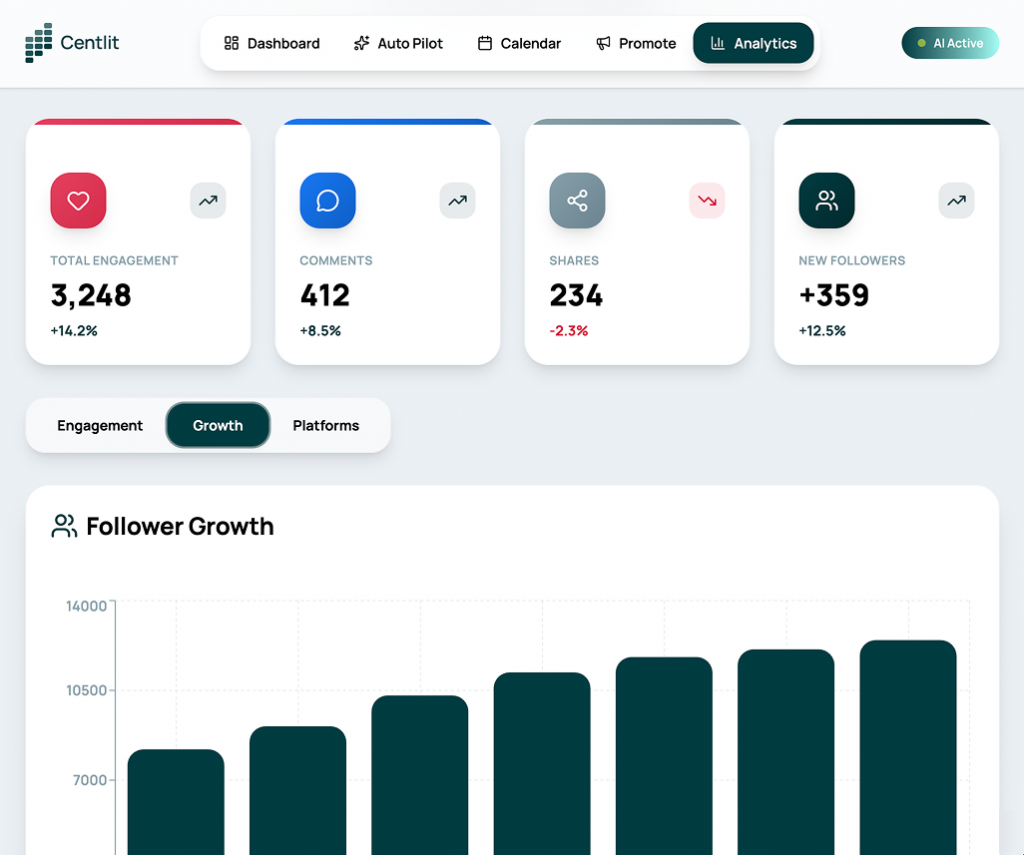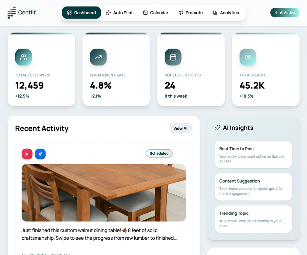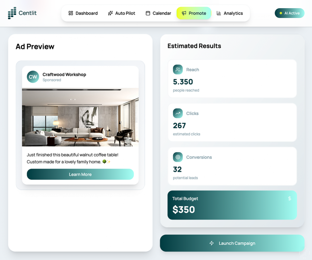 Set your budget and objective—Centlit builds and optimizes your ad campaigns for you.